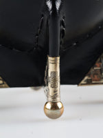 Een opvallend stijlvolle kalebas met een modern karakter. De Imperial Goldsmith Black combineert strak, glad zwart leer met een brede alpaca ring in een opvallend geometrisch kruismotief. Bijzonder aan dit model zijn de bijpassende alpaca voetjes met hetzelfde patroon en gouden bolvormige accenten, die de kalebas een luxueuze en eigentijdse uitstraling geven.